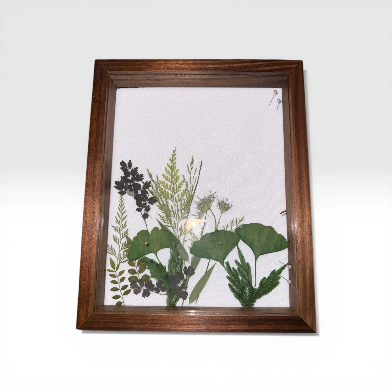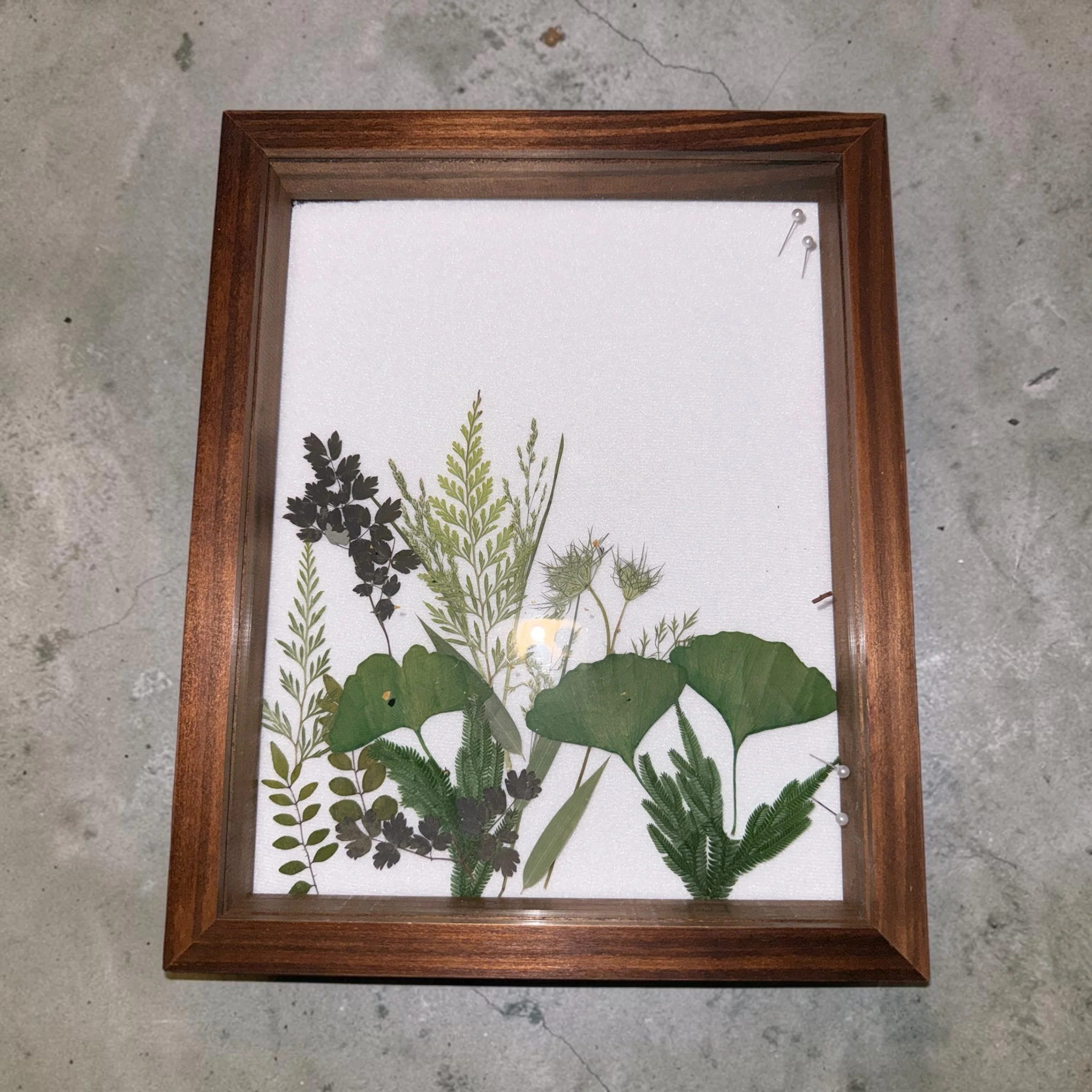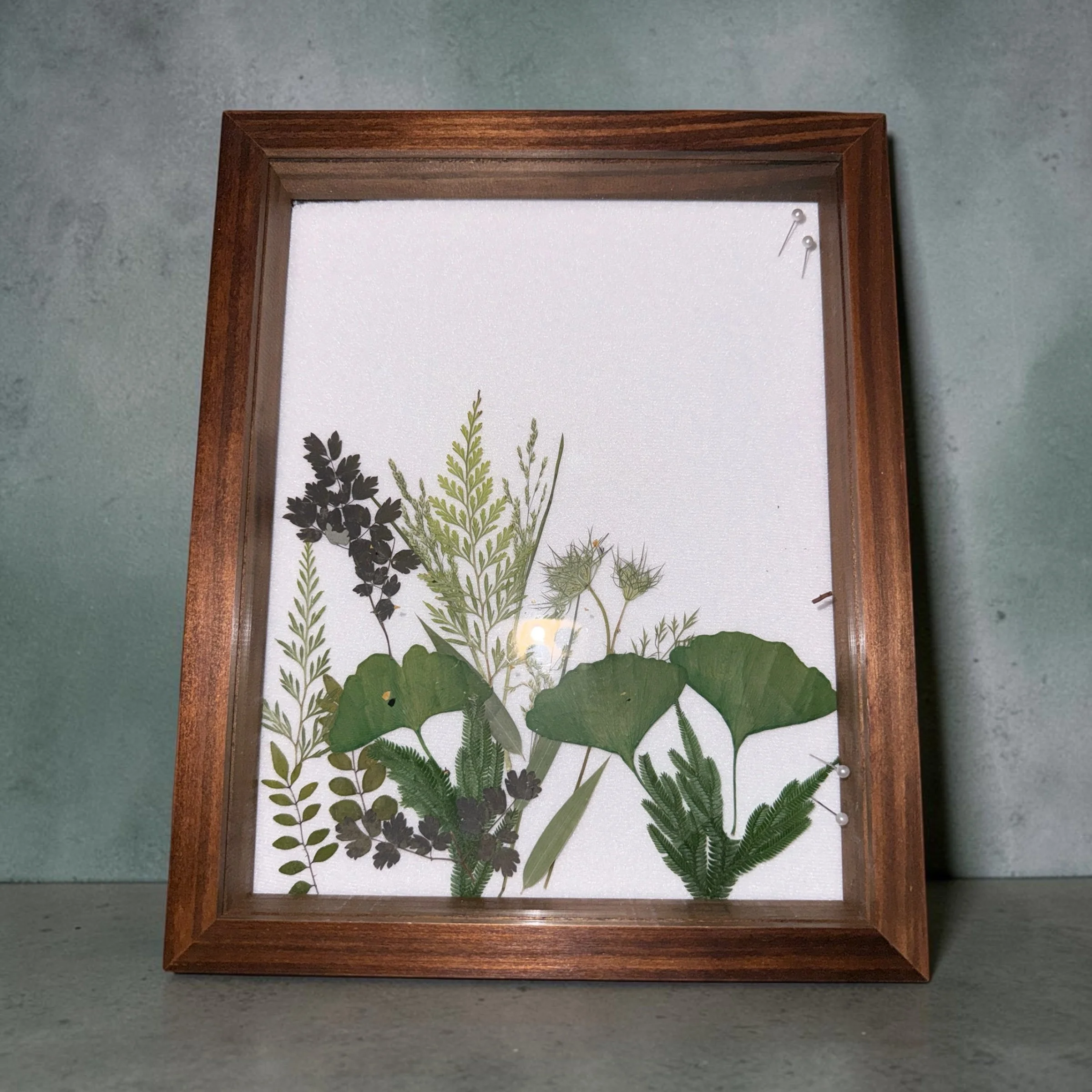 A curated arrangement of pressed leaves and stems, preserved behind glass in a natural wood frame. Organic, quiet, and textural — a one‑of‑a‑kind botanical study for layered, collected interiors.
