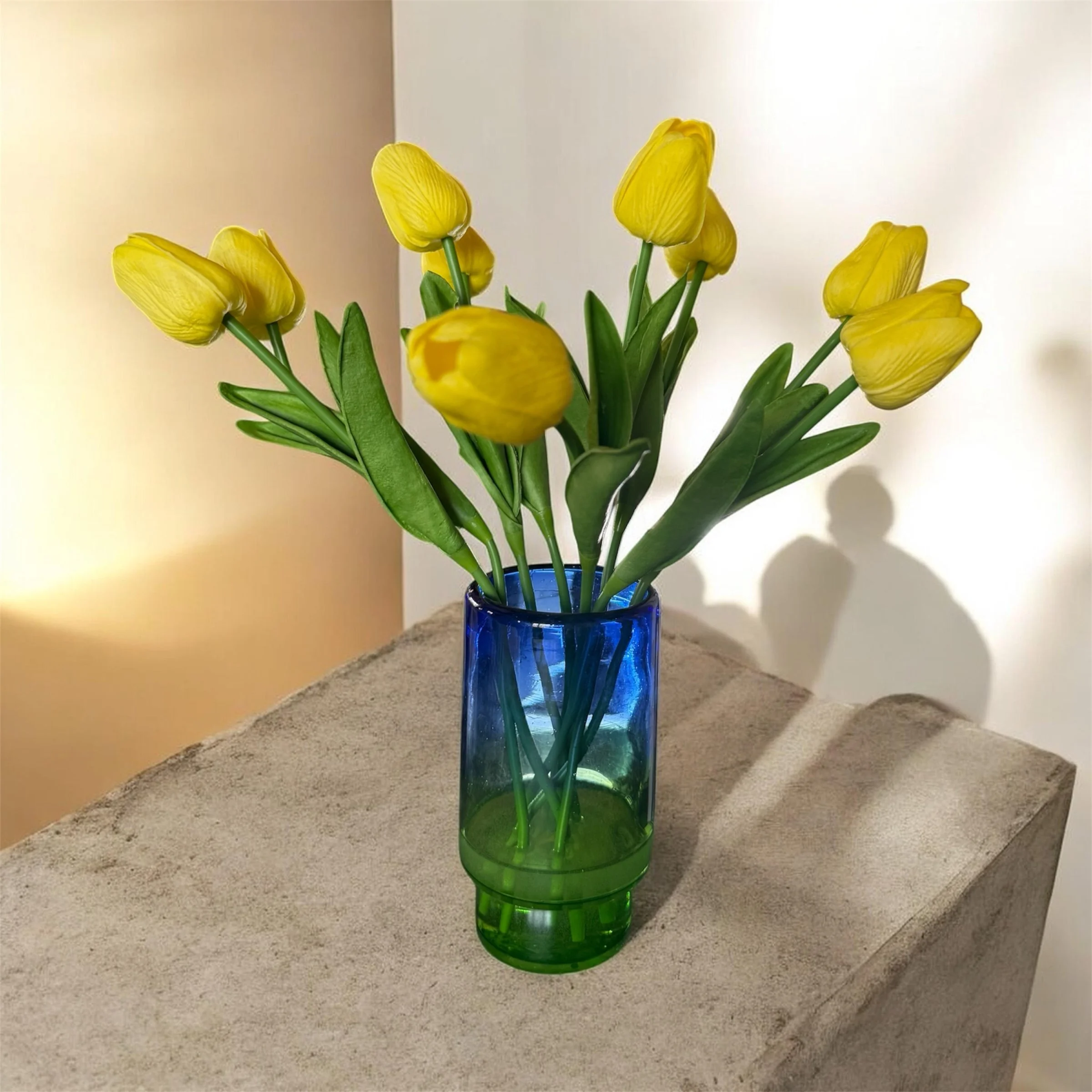 A vibrant arrangement of real touch permanent yellow tulips presented in a striking two‑tone glass vase with a green base and blue upper. The clean, modern silhouette and bold color contrast make this piece a standout centerpiece for dining tables, entryways, or office desks.